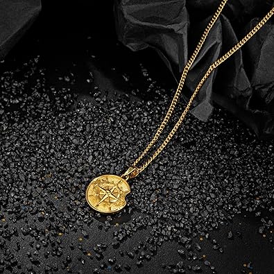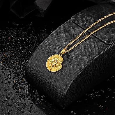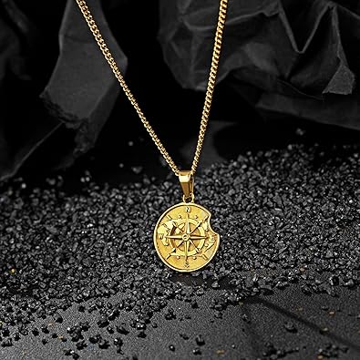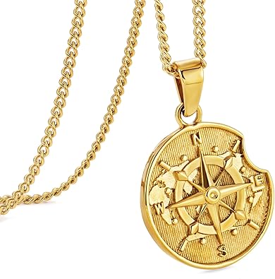 - Novel Design: This stainless steel compass pendant necklace for men is in silver and gold, 3 styles: stainless steel necklace with round/lost circle/shield pendant. The pattern of compass pendant is designed in 3D engraving of world map, it always helps us find the right direction in life. It will be our best companion when you are in troubles, give you the courage to go forward