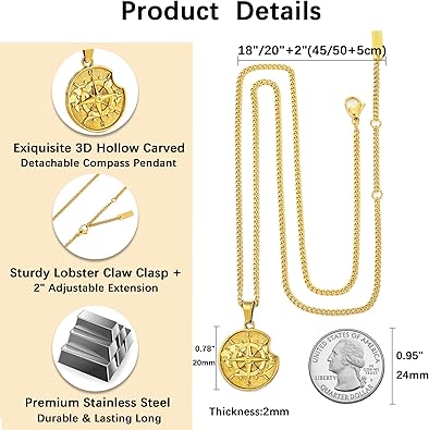 - Size: Necklace length: 18"(45cm)/20"(50cm) curb chain + 2"(5cm) adjustable extension, compass pendant: 20mmx 20mm, lobster clasp design is easy to put on and take off, this compass necklace can be layered with other necklaces or you can combine the pendant with other necklace
